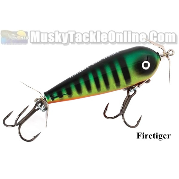 Suick's Cisco Kid Topper: One of the most celebrated topwater baits of all time past down from generation to generation. The “Topper” is a superb surface fishing lure featuring stainless steel propeller blades on the nose and tail and a torpedo profile body to create a lifelike wake on the water. Works well at any speed. Designed to attract muskie, pike, bass and fish of all kinds. A remarkable fish catcher. Durable plastic construction with two 3/0 trebles.