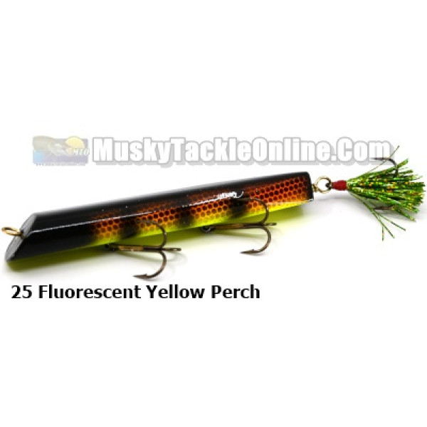 The Wade's Wobbler is made from select kiln dried wood for buoyancy and consistent density. There are approximately six coats of paint for durability. For better fatigue resistant bends, 1/16" brass wire is used and is run through the lures. The lure will back up with slack line so you can clear weeds or back off a rock and continue your retrieve with a clean lure. Just like the standard Wade's Wobbler, only dressed with a tinsel tied rear treble hook.